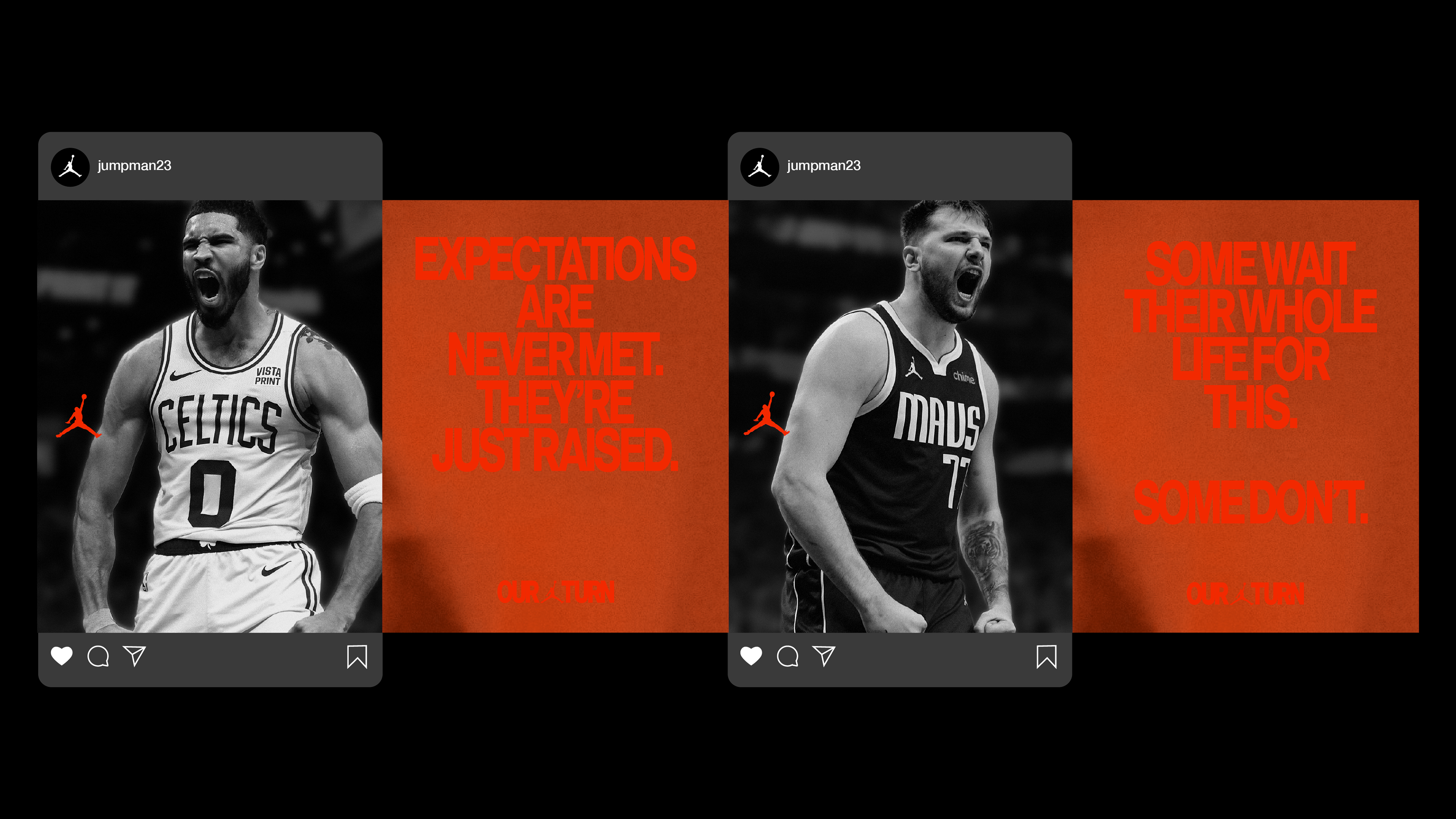 As a designer, I was tasked with finding high-level expressions, large-scale OOH, and social moments that Jordan Brand could leverage to push the messaging of Our Turn and The One. A major moment they needed to address was the possibility of their two biggest players facing off in the finals — and how to celebrate both of them on social media.